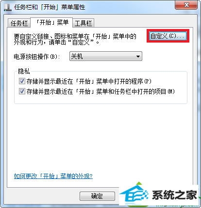 4、 打开单击“「开始」菜单属性”窗口后,切换到“「开始」菜单”选项卡,然后点击“自定义”;