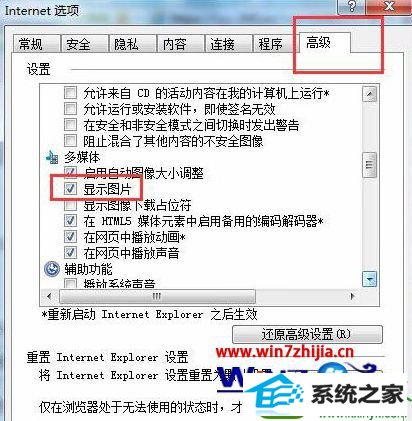 6、在internet选项中点击“高级”勾选“显示图片”后确定。