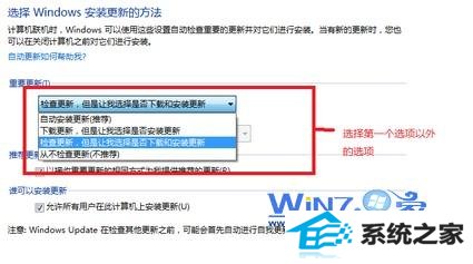 4、然后在重要更新的栏目下的下拉按钮中选择除了“自动更新(推荐)”以外的其他选项,然后点击确定按钮;