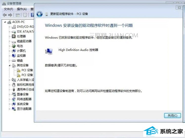 1、比如更新驱动程序等操作,出现数据错误(循环冗余检查)的故障,一般是硬盘读写出错了。