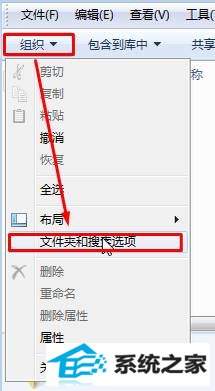 1、打开“计算机”或任意文件夹,点击"组织"—“文件夹和搜索选项”;