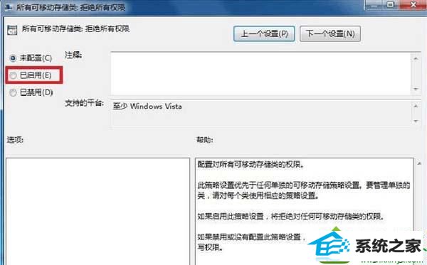 使用gpedit.msc,在所有可移动存储类:拒绝所有权限,里面显示的是未配置,按说是没有阻止访问的(也可能是显示的和注册表不一致呢)。点击“已禁用”;