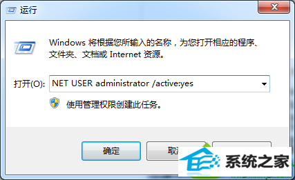 3、打开命令提示符后,我们输入 nET UsER administrator /active:yes 并回车;