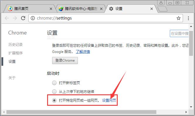 2.在打开的窗里面,大家选择“配置——启动时——打开特定网页或一组网页”选项,其次点击“配置网页”。