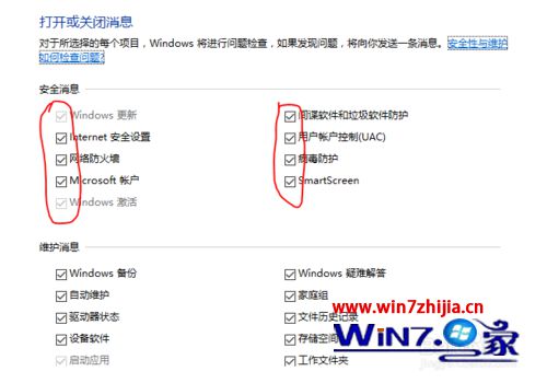 8、在这里你会发现,什么防火墙啊,病毒防护啊等等一系列的系统提示都可以在这里取消提示。只需要在不想要系统提示的项面前把对勾取消掉,最后,点击“确定”保存设置。