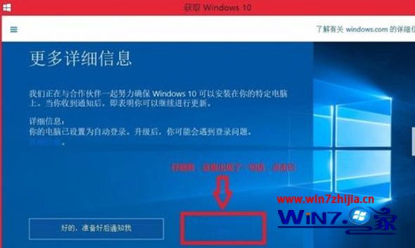 3、打开升级助手,在更多详细信息窗口中,中间靠下的位置出现了一句话,点击它;
