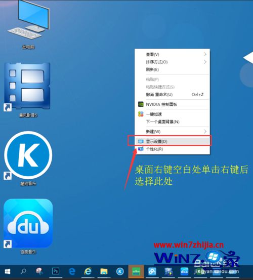 1、在win7系统桌面空白处单击右键,选择“显示设置”;