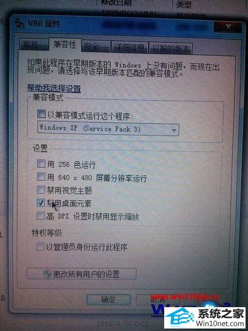 3、接下来就是关键的一步,点击兼容性,找到里面的一个禁止桌面元素复选框,然后点击确定就可以了。