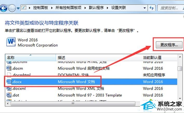 4、在名称中找到“.doc”、“.docm”、“docx”,分别选中这几个类型,然后点击“更改程序”;