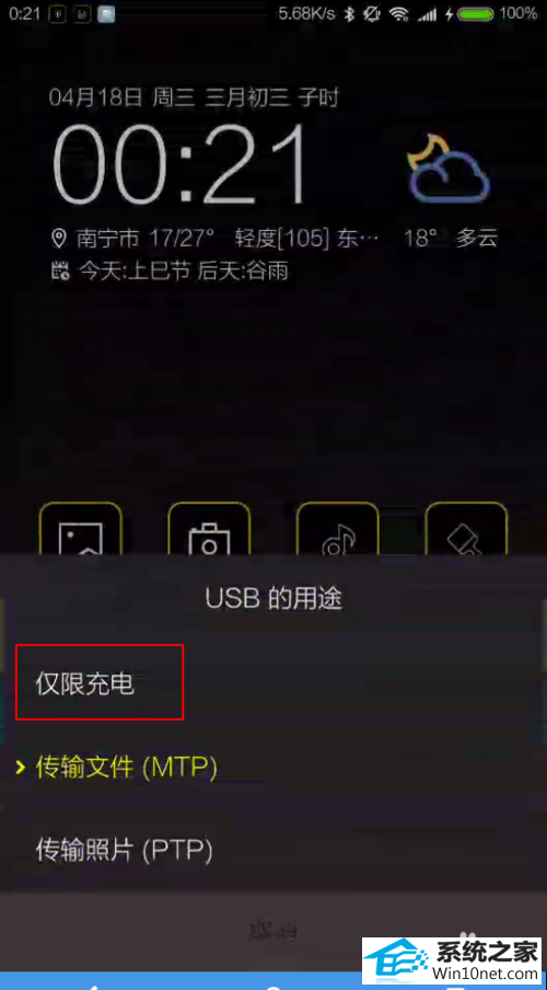 2:点击通知栏正在通过UsB传输文件,然后选择仅充电,接着再选着传输文件。