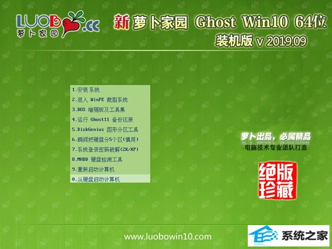 萝卜家园ghost win10 64位装机版2019.09系统稳定为第一制作要点,集成常见硬件驱动,智能识别+预解压技术,绝大多数硬件可以快速自动安装相应的驱动。在不影响大多数软件和硬件运行的前提下,已经尽可能关闭非必要服务。在稳定的基础上极限发挥系统最好的性能防黑屏,安装方便快速,支持多种安装方式,支持硬盘安装让安装win10系统简单无比。