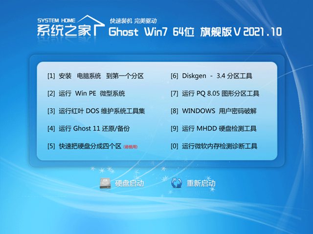 系统之家Win7系统64位旗舰版V2021.10版本安装方法:(无光盘、U盘,推荐)
